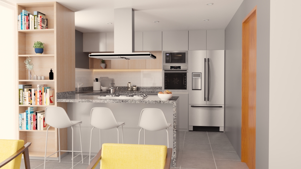 La cocina, sala y comedor se plantean como un espacio continuo que maximiza la amplitud visual y optimiza el uso eficiente del área disponible.