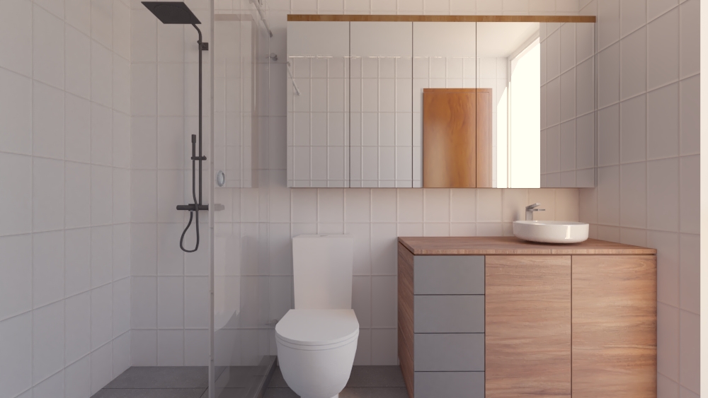 Integración de acabados existentes con nueva mampara de vidrio y mobiliario funcional, priorizando durabilidad y facilidad de mantenimiento.