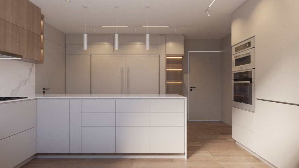 Se diseñó un nuevo sistema de mobiliario en acabado blanco roto, aportando luminosidad y atemporalidad. Se incorporaron soluciones de almacenamiento que permiten ocultar electrodomésticos de uso cotidiano, garantizando una lectura limpia y ordenada.
